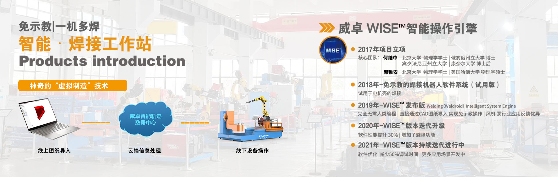 無錫威卓智能機器人有限公司成立于2017年,是無錫市政府引進的科技領軍型高新技術企業(yè),公司研發(fā)團隊80余人,我們堅持自主創(chuàng)新,利用自主開發(fā)的虛擬制造技術對傳統(tǒng)焊接行業(yè)進行升級改造。 公司主推的工業(yè)風機系列-智能焊接工作站產(chǎn)品,具有免示教、實時跟蹤、簡易工裝、傻瓜式操作等優(yōu)點,真正幫助企業(yè)解決了招焊工難,用工成本高,焊接質(zhì)量不穩(wěn)定等問題。